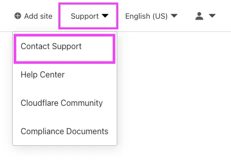 2. In the upper right corner of the Cloudflare dashboard, click Support and select Contact Support.